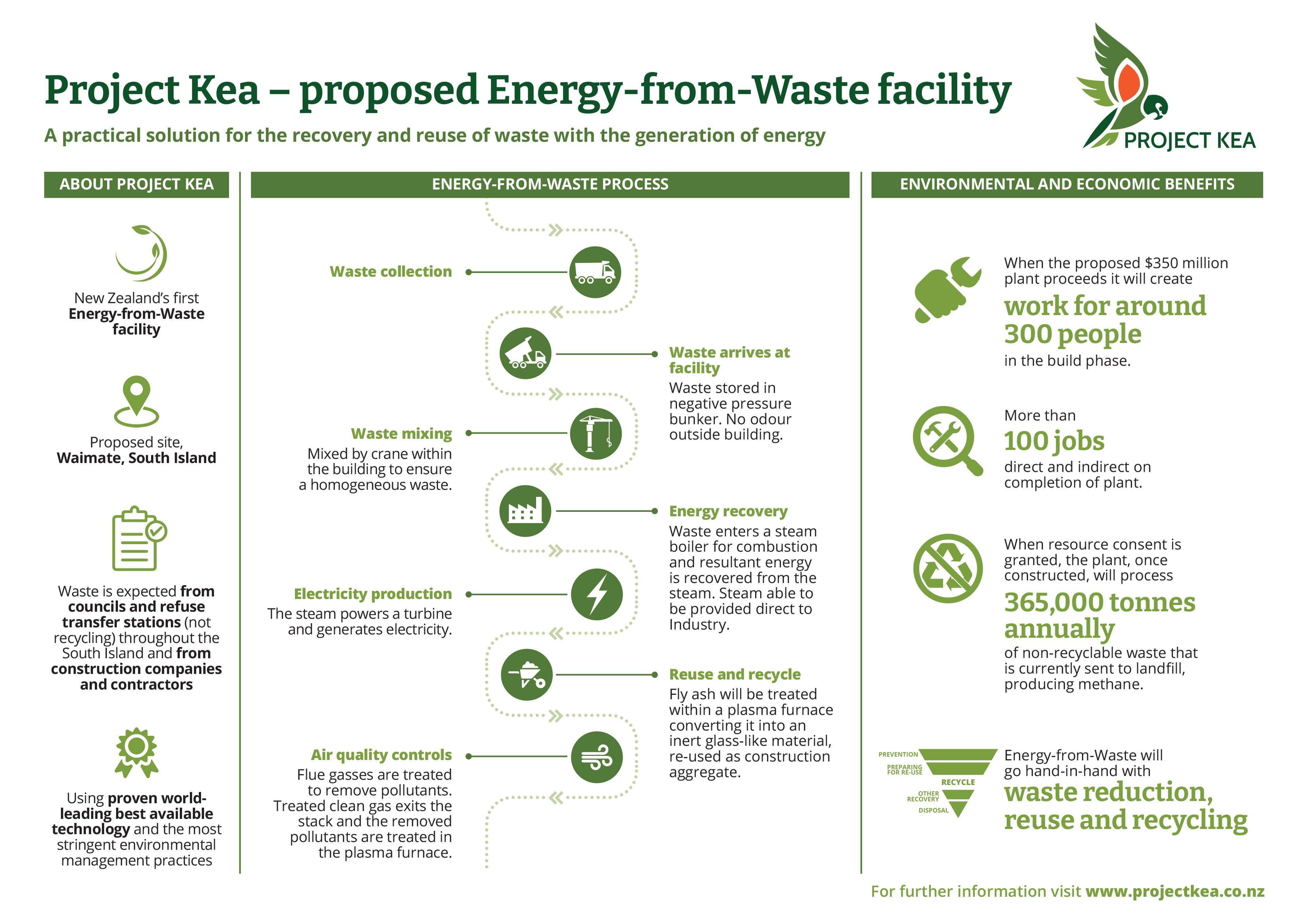 We also created infographics showing how the technology works and simple process maps explaining the Resource Management Act consenting process. Convergence organised and implemented ‘meet the Directors’ open days in Waimate, near the likely site of the Energy-from-Waste facility, where residents and local businesspeople could drop in and discuss the project. Infographics and written information were displayed to explain the plant and its local impacts.